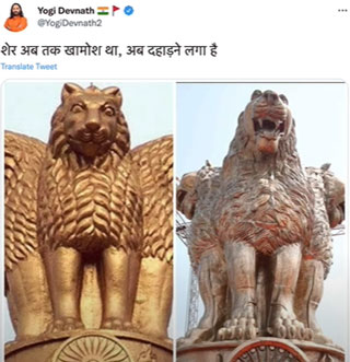 ରାଜଧାନୀ ଦିଲ୍ଲୀ ରେ ନୂଆ ସଂସଦ ଭବନର ଛାତ ଉପରେ ଲାଗିଥିବା ବିଶାଳକାୟ ଅଶୋକସ୍ତମ୍ଭ କୁ ଦେଖି ଲୋକମାନେ ଏଭଳି ଭାବରେ ଖୁସି ଅଛନ୍ତି ଯେ ଏହି ଅଶୋକସ୍ତମ୍ଭର ବାହାନରେ କଂଗ୍ରେସ ଉପରେ ନିଶାନ କରିବାକୁ ଲାଗିଲେଣି । ଏଥିପାଇଁ ହିନ୍ଦୁ ଯୁବବାହିନୀର ଗୁଜୁରାଟ ପ୍ରଭାରୀ ଯୋଗୀ ଦେବନାଥ ଦୁଇଟି ଫଟୋ କୁ ଟ୍ଵୀଟ କରି ଲେଖିଲେ ବାଘ ବର୍ତ୍ତମାନ ପର୍ଯ୍ୟନ୍ତ ଚୁପ ଥିଲା ବର୍ତ୍ତମାନ ଗର୍ଜନ କରିବାକୁ ଲାଗିଲାଣି ।