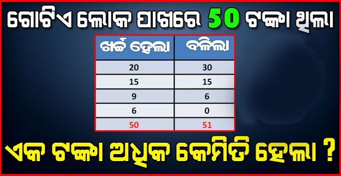 ୧୨. ଗୋଟିଏ ଲୋକ ପାଖରେ ୫୦ ଟଙ୍କା ଥିଲା ପ୍ରଥମେ ସେ ୨୦ ଟଙ୍କା ଖର୍ଚ୍ଚ କଲା ତା ପାଖରେ ଆଉ ୩୦ ଟଙ୍କା ବଲିଳା, ତା ପରେ ସେ ୧୫ ଟଙ୍କା ଖର୍ଚ୍ଚ କଲା ତା ପାଖରେ ୧୫ ଟଙ୍କା ରହିଲା, ତା ପରେ ସେ ୯ ଟଙ୍କା ଖର୍ଚ୍ଚ କଲା ଆଉ ତା ପାଖରେ ୬ ଟଙ୍କା ରହିଲା, ତା ପରେ ସେ ୬ ଟଙ୍କା ଖର୍ଚ୍ଚ କଲା ଆଉ ଠାଆ ପାଖରେ କିଛି ନଥିଲା । ଏଠାରେ ଆମେ ଖର୍ଚ୍ଚ ଟଙ୍କା ଯୋଗ କଲେ ୫୦ ଟଙ୍କା ହେଉଛି କିନ୍ତୁ ଯାହା ବଳିଥିଲା ତାକୁ ଯୋଗ କଲେ ୫୧ ଟଙ୍କା ହେଉଛି ?