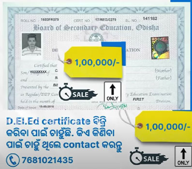ଲକ୍ଷେ ଟଙ୍କାରେ ବିକି ଦେବି ସାର୍ଟିଫିକେଟ ଚାକିରି ନାହିଁ ସାର୍ଟିଫିକେଟ ରଖି କି ଲାଭ । ସୋସିଆଲ ମିଡିଆରେ ଦେଲେ ସରତିଫିକେଟ ବିକ୍ରି ପାଇଁ ବିଜ୍ଞାପନ । ମୋର କାମରେ ଆସୁନି ଆଉ କାହାର କାମରେ ଆସୁ । ବନ୍ଧୁଗଣ ଏ ବିଜ୍ଞାପନ ଦେଖନ୍ତୁ । ମୁଁ ମୋ OTET ସାର୍ଟିଫିକେଟ ବିକ୍ରି କରିବା ପାଇଁ ଚାହୁଁଛି, କିଏ କିଣିବା ପାଇଁ ଚାହୁଁ ଥିଲେ ମୋତେ ଯୋଗାଯୋଗ କରନ୍ତୁ । ଖାଲି ସେତିକି ନୁହେଁ ଆହୁରି ଦେଖନ୍ତୁ ମୁ ମୋର ଡ଼ିଇଆଇଆଇଡ଼ି ସାର୍ଟିଫିକେଟ ବିକ୍ରି କରିବା ପାଇଁ ଚାହୁଁଛି ।